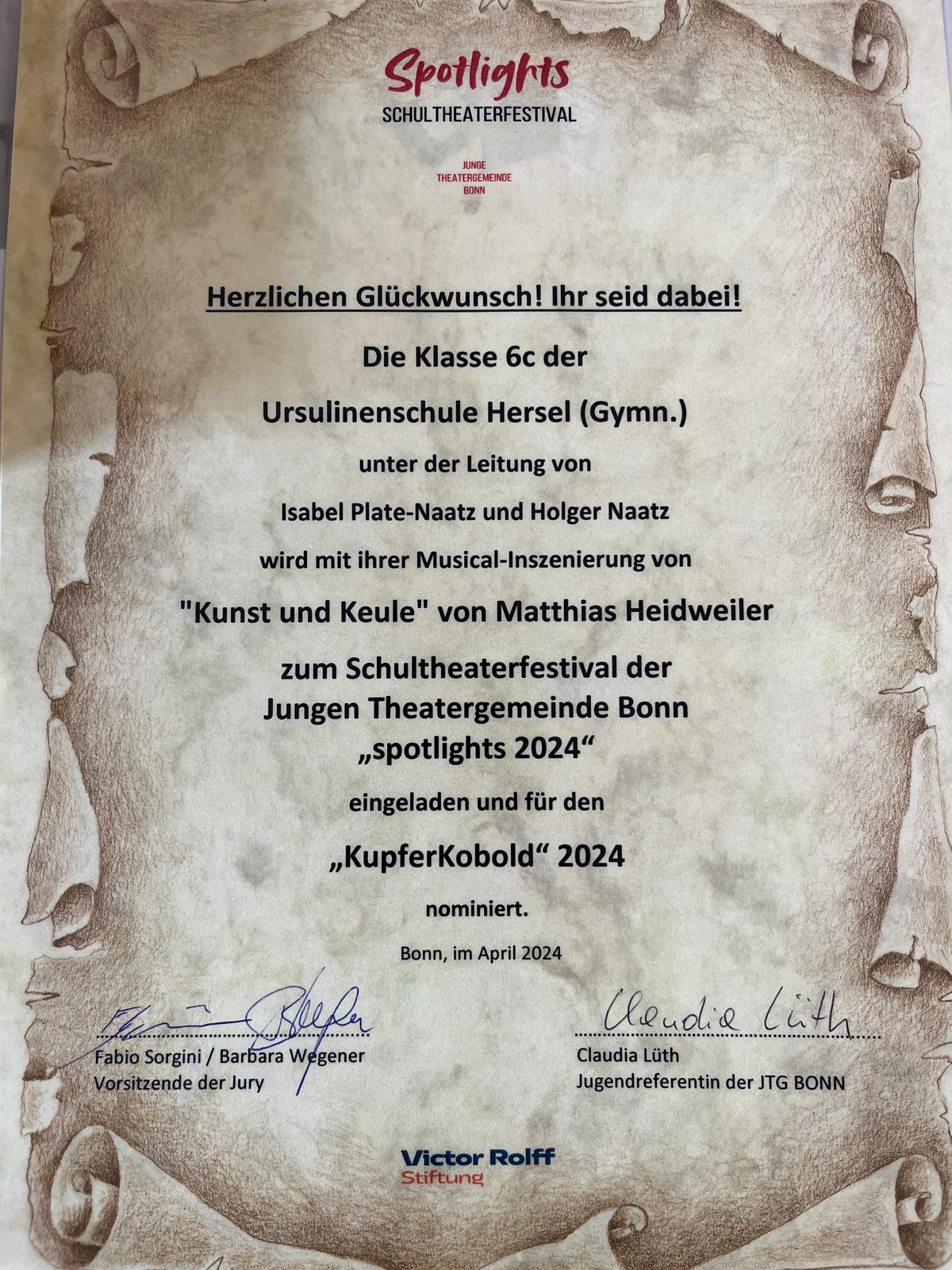 - Die Klasse 6c der Ursulinenschule Hersel in Bornheim wurde mit ihrer Musicalaufführung von "Kunst und Keule" zum Schultheaterfestival